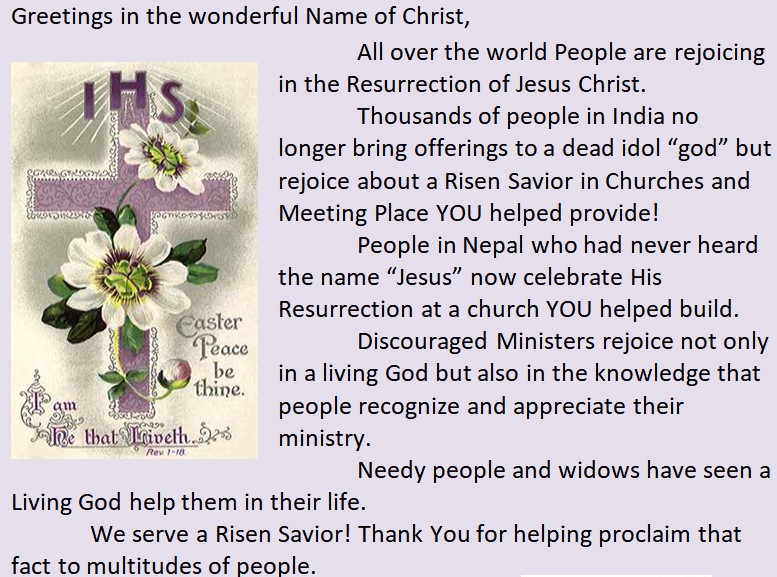 My wife Milly and I plan to go to India March 7th and we are to return on April 7th. We are to celebrate our 75th annual conference which is dated from when Mom and Dad were appointed as missionaries to India in March of 1951. We plan to visit our work in North India and Nepal and dedicate at least two of the churches under construction. We then plan to visit our South India work. Please pray for safety, good health and open and effectual doors for ministry.